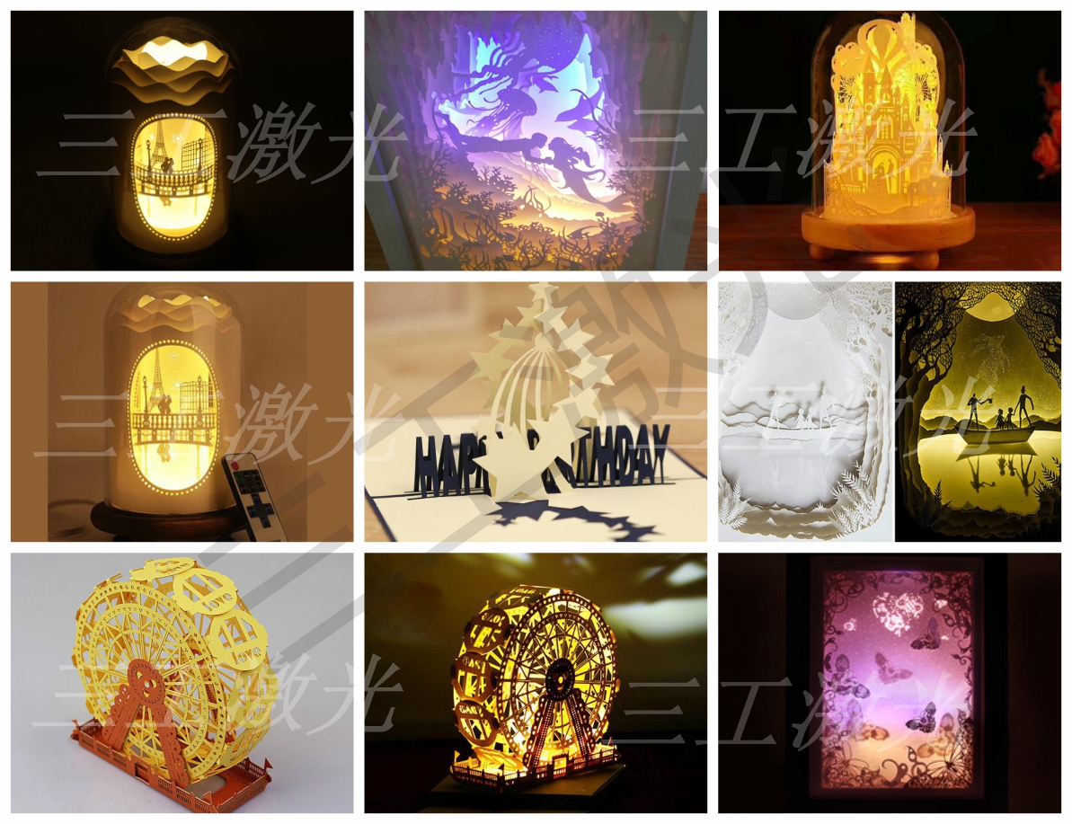 紙本來是極為樸素的媒介,然而讓人驚訝的是,加上光與影的結(jié)合,居然呈現(xiàn)出這樣神秘而夢(mèng)幻的畫面。光影紙雕燈將中國(guó)傳統(tǒng)元素的剪紙與皮影,以及現(xiàn)代的審美與設(shè)計(jì),巧妙又和諧的融合在一起了。而3D紙雕燈,更是在傳統(tǒng)2D紙雕燈的基礎(chǔ)上進(jìn)行了突破,通過層疊的紙雕圖案,讓原本樸素的紙張,在光影之下,呈現(xiàn)出神秘而又夢(mèng)幻的畫面。很多人熱衷于采用手工制作的方式來之多紙雕燈,優(yōu)點(diǎn)在于自己動(dòng)手,可以體驗(yàn)制作的樂趣,成品也顯得很有意義,缺點(diǎn)在于制作費(fèi)時(shí)費(fèi)力,而且圖案要求制作的很精細(xì)。那么對(duì)于大批量的生產(chǎn)來講,必定要穩(wěn)定性好,效率高的機(jī)器才能滿足生產(chǎn)需求!而光影紙雕燈激光鏤空機(jī)既是這樣一個(gè)存在。