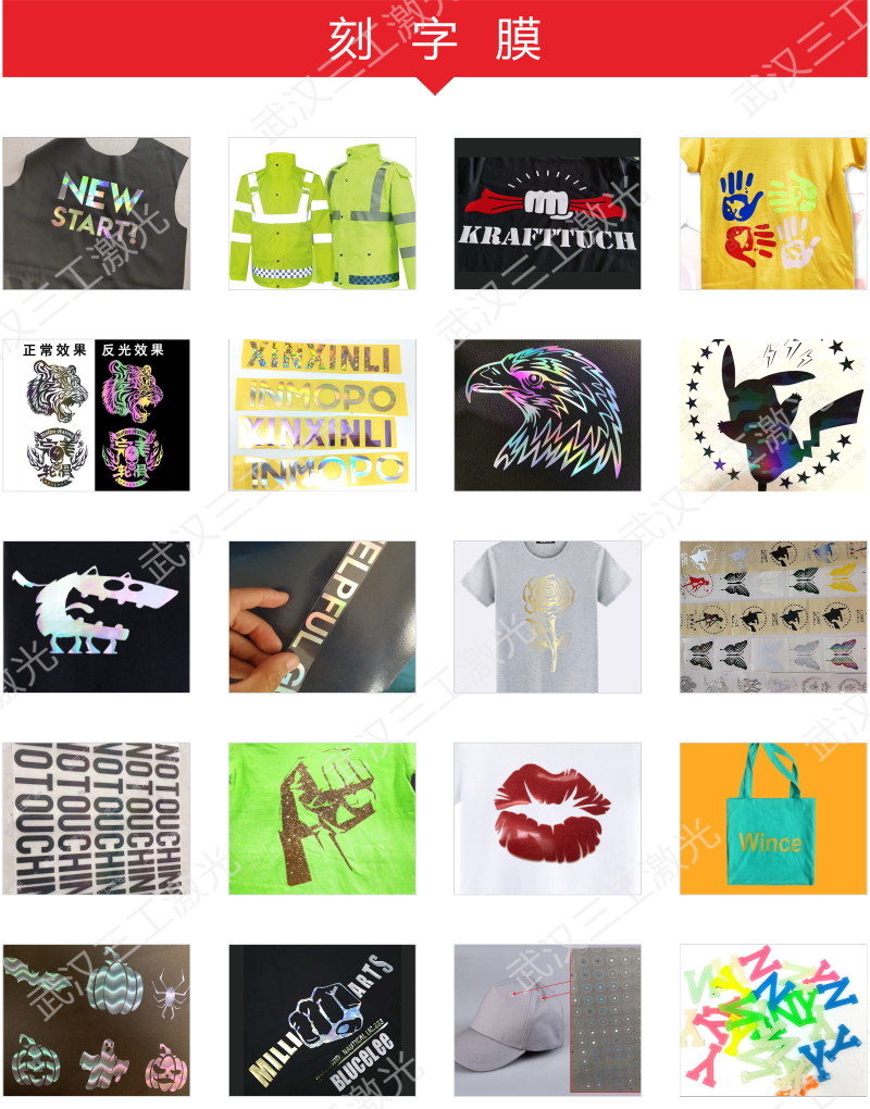 熱轉印刻字裝飾膜作為互聯網時代的新技術新產品,擁有無需制版、環保、操作簡單快捷的特點。傳統刻字膜刻字機角度、速度等等因素都容易造成產品質量問題,速度太快容易出故障,刻不斷等等。而采用激光打標技術進行刻字膜的雕刻,速度超快精度更高,電腦 精準控制精度可達0.1mm,制作的刻字膜圖案更精美。設備可帶CCD定位系統,針對各類燙畫以及服裝裁片的印花圖案可以進行精準雕刻裁切!