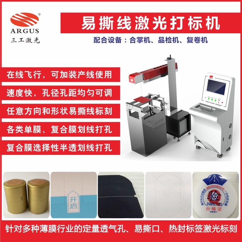 商品包裝或者包裝的表面總是有一層塑料薄膜來保護商品以免受潮或者污染,為了便于打開,經常有設計的有易撕口或者虛線孔,這一小小的設計給生活帶來了便利。經常會看到一些物品采用薄膜軟包,上面有一排小小的透氣孔,例如常見的電子產品充電器上,一層薄薄的軟薄膜,淺淺的一排定量透氣孔。定量透氣孔采用激光打孔,便捷快速,效果好。三工激光定量透氣孔激光打孔機,以其優越的加工特性,成為很多商家的選擇。三工激光易撕線激光刻線機主要用于不同材質的塑料包裝袋 ,例如PE、PVC、PET等各種薄膜材質。可用于飲品飲料、文化用品、五金工具、日用百貨、電子電器、金屬制品等行業的定量透氣孔、易撕口、熱封標簽等激光標刻。